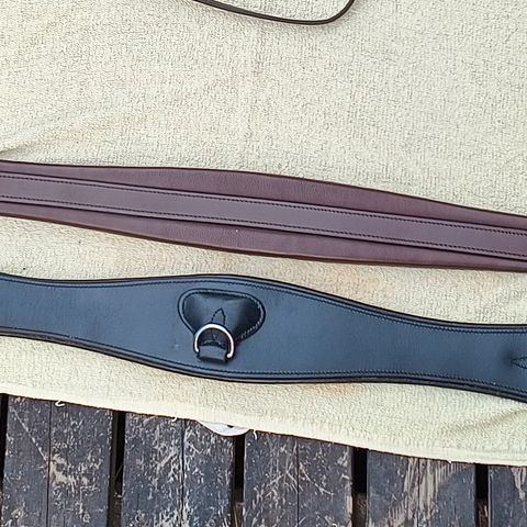 Uusi, muotoiltu nahkainen satulavyö. Väri ruskea ja pituus 120cm. Joustot molemmissa päissä.