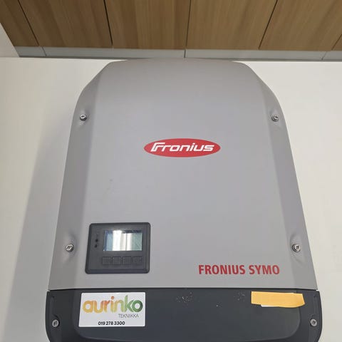 Fronius Symo aurinkoinvertteri. Laitteessa on etupaneelissa näyttö ja käyttöpainikkeet. Soveltuu aurinkosähköjärjestelmän tasavirran muuntamiseen vaihtovirraksi kiinteistön sähköverkkoon.