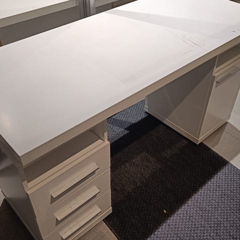 Erittäin vanha työpöytä. Ollut käytössä. Edessä iso laatikko ja kaappi, jossa ylhäällä vetolaatikoita. Tästä kunnostusprojekti. Koko noin 1m leveä ja 50cm syvä. Korkeus n 70cm.
