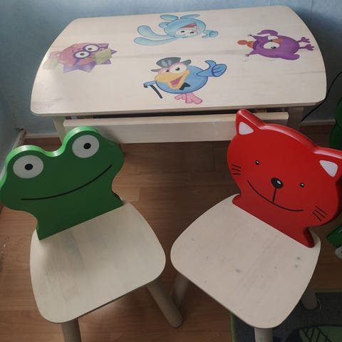 IKEA Kritter pöytä & tuoli. Ostettu uutena ja ollut vain yhden lapsen maltillisesta käytössä. Erittäin siisti yleisilme mutta pientä käytön jälkeä läheltä katsottaessa (katso esimerkkikuvat). Täysin ehjät ja tukevat!