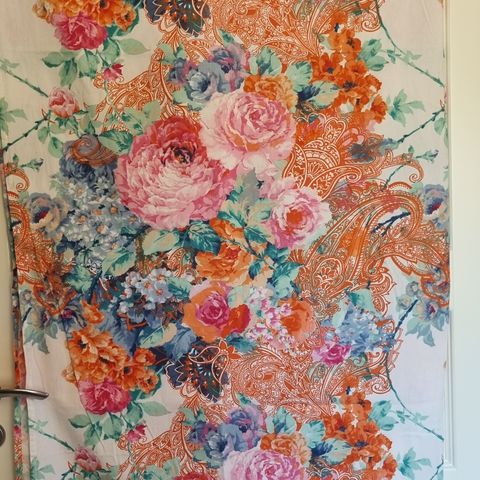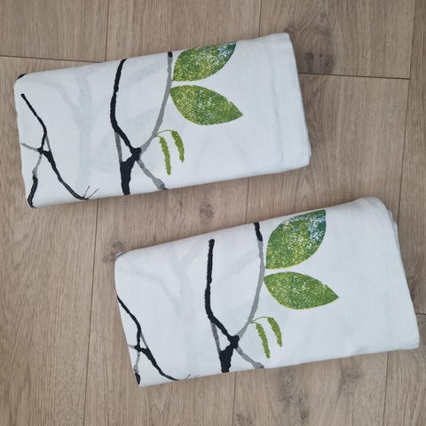 Jotexin puuvillaiset, raidalliset verhot. Hyväkuntoiset. Pesty, mutta en ole silittänyt. Laitoin malliksi ikkunaan, mutta auringon paiste muuttaa väriä. Lähikuvassa näkyy oikea väri. Purjerenkaat.