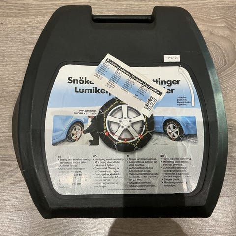 Kuvan mukaisessa laatikossa käyttämättömät 16 mm paksut lumiketjut. Sopivat esim. asuntoauton renkaisiin 225/65 x 16. Nouto tai toridiili.