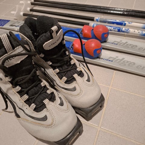 Suksisetit, sukset 110 cm ja monot 30,5. Sauvoista puuttuu remmit.