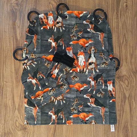 Geggo Designin ihana kaksipuolinen vaunuverho. Toisella puolella metsolan pupu kuosi!