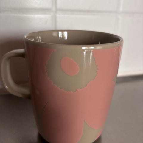 Erittäin hyväkuntoiset Marimekon unikko kausimukit. Tilavuus 2,5dl. Pohjaväri terra ja unikko persikka/ vaaleanpunainen.
