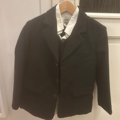 Myydään kuvassa oleva, kerran käytetty 3-osainen puku( takki, housut ja liivi). Koko 130 cm.