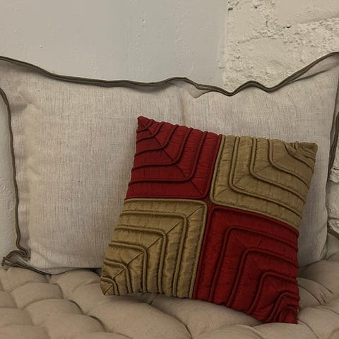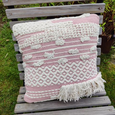 Anno Collection pilven muotoinen koristetyyny. Tyynyssä on vaaleanpunaiset ja valkoiset vinoraidat sekä kanttaus reunoissa. Päällinen on 100 % puuvillaa.