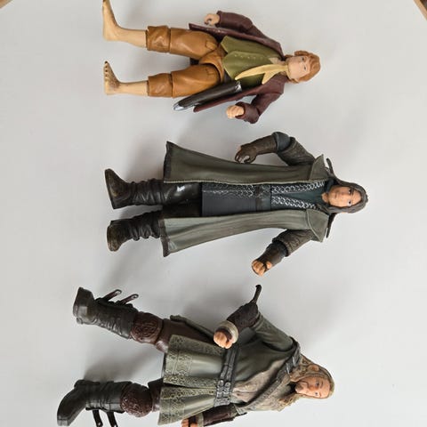 Kuvanmukainen setti Lord Of The Rings figuureita. Sisältää seuraavat hahmot : Boromir, Aragorn, Legolas , Merry, Pippin, Theoden , Gil Galad sekä Metsähaltija. Pippiniltä ja Merryltä miekat kateissa ja muutama tuppi puuttuu. Muuten kaikki osat ja varusteet tallella