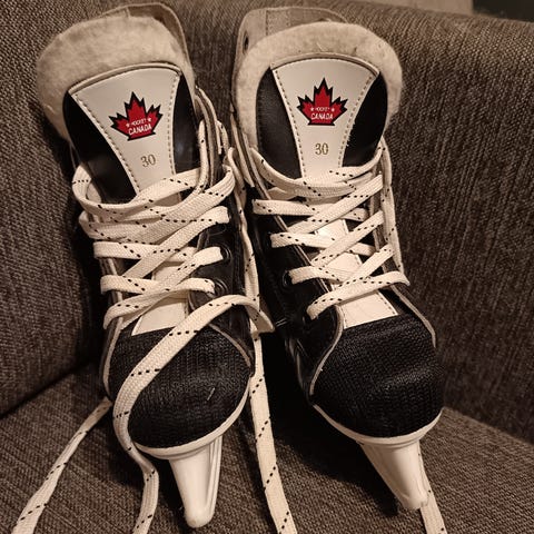 Hyväkuntoiset Easton luistimet. Koko on Y12 ja taulukon mukaan se on normaali koko 30.