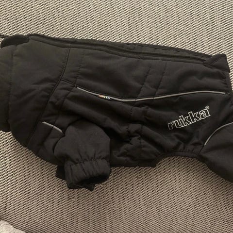 Rukka lämpöhaalari koiralle. Musta ulkopinta ja lämmin, pehmeä teddyvuori sisäpuolella. Haalarissa on pitkät lahkeet, joustavat lahkeensuut sekä vetoketju selän päällä pukemista helpottamassa. Heijastintereet parantavat näkyvyyttä hämärässä.