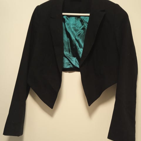 Halonen Chic bolero, koko 36. Väri musta ja materiaali polyesteri. Lyhyt, avonainen malli ilman napitusta. Sopii esimerkiksi mekkojen ja toppien kanssa käytettäväksi naisten juhlavaatteena tai asun kevyenä lisäkerroksena. Vähän kiiltävä kangas. Olka-olka 37 cm, olka-hiha 43 cm, olka-helma 33 cm.