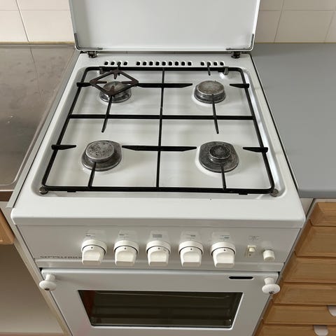 UPO kaasuliesi. Vapaasti sijoitettava kaasuliesi, jossa on kaasukeittotaso ja uuni. Ulkoväri valkoinen vaaleansinisellä etupaneelilla. Vanhempi malli, mekaaniset säätimet .