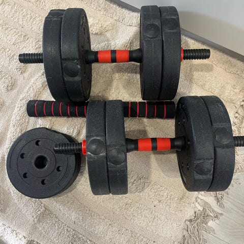 Säädettävät käsipainot, joissa metalliset tangot ja mustat valurautaiset painolevyt. Ostettu Lidlistä.