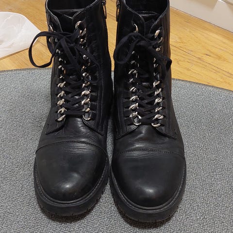 Gabor maiharit, koko 6,5. Mustat nauhalliset nilkkapituiset saappaat, joissa sivuvetoketju molemmilla puolella pukemisen helpottamiseksi. Päällinen sileää nahkaa ja paksu, kuvioitu kumipohja. Sopivat arkeen, vapaa-aikaan ja juhlaan.
