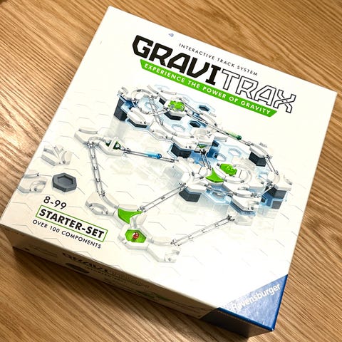 Gravitrax Starter Set kuularata lelu. Peruspakkaus sisältää kuularadan rakentamiseen tarvittavia osia, kuten pohjalevyjä, erilaisia radan osia, tukipaloja ja kuulia. Osat ovat pääosin muovia. Sopii valmistajan mukaan noin 8 vuotta täyttäneille lapsille ja nuorille. Settiä voi käyttää erilaisten ratojen rakentamiseen ja laajentaa yhteensopivilla Gravitrax-lisäosilla.