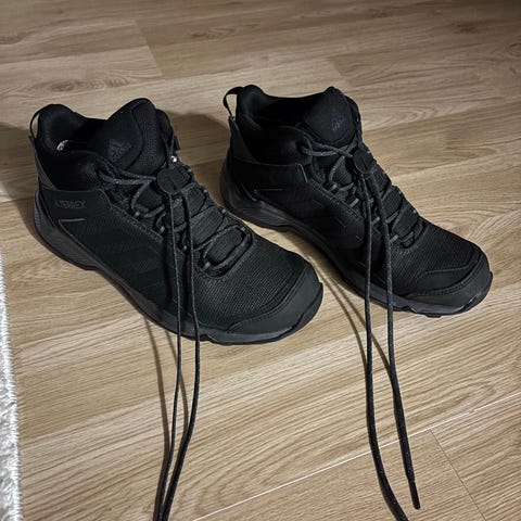 Pari kertaa käytetyt Adidas vaelluskengät. Vaikka lesti on leveä, kenkä oli minulle liian kapea. Vedenpitävä, hengittävä RAIN.RDY sulkee kosteuden ulkopuolelle.Keskikorkea varsi ja tiivistetty kieleke pitävät roskat ulkopuolella. Traxion-ulkopohja tarjoaa varman pidon kaikilla maastoilla.