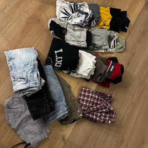 Myydään kuvan vaatteet. Kaikki uutena ostettu ja yhdellä pidetty. Kokomerkinnät vaihtelee mutta kaikkia pidetty 122-128-kokoisella.