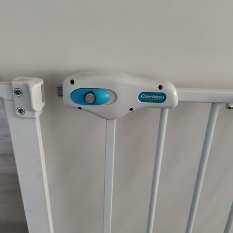 Valkoinen metallinen turvaportti, jossa pystysuuntaiset pinnat ja keskellä avattava kulkuaukko. Portti soveltuu esimerkiksi oviaukkoihin tai portaikkoihin tilan rajaamiseen. Kiinnitys tapahtuu säädettävillä kiristimillä seinään tai karmiin, Materiaali on maalattua metallia, valkoinen. Säädettävissä 120 cm - 75 cm.
