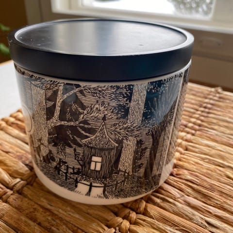 Myynnissä peltinen kannellinen peltipurkki suodatinpussien säilyttämiseen. Latvus -kuosissa seikkailee tutut Muumihahmot viidakon puiden latvojen seassa.