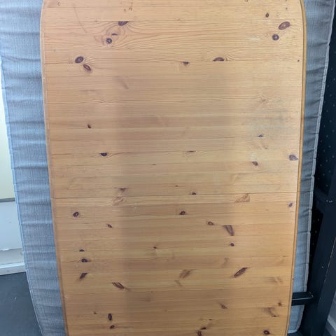 Reilunkokoinen ruokapöytä, jossa kauniit jalkaliitokset. Materaalina pyökki, koivu ja koivuviilu. Tuolit eivät ole myynnissä.