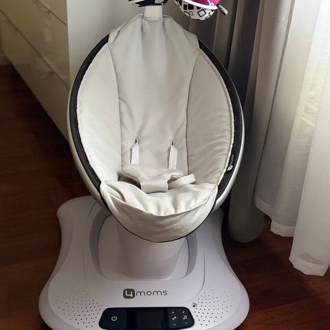 4moms lasten tuoli. Sähkökäyttöinen vauvan istuin, jossa on pehmeä musta istuinosa ja turvavaljaat. Jalustassa on ohjauspaneeli liike- ja äänitoimintojen säätöön. Soveltuu vauvan lepäämiseen ja kevyeseen keinuttamiseen sisätiloissa valmistajan ohjeiden mukaisesti. Kaikki on puhdasta ja toimintakunnossa.