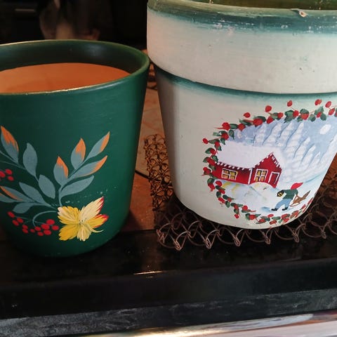 Myyn kaksi Tyrvään keramiikan punasavista kukkaruukkua. Isomman suuaukon halkaisija on n. 16,5 cm, korkeus n. 14 cm. Pienemmän suuaukon halkaisija on n. 14 cm, korkeus n. 12 cm. Nämä ruukut ovat todella vanhoja, koska Tyrvään keramiikan kerrotaan lopettaneen toimintansa 1950-luvulla. Tätä tietoa en ole pystynyt vahvistamaan, mutta joka tapauksessa nämä ovat paljon käytettyjä, löytyy rosoa ja patinaa. Molemmat ruukut ovat ehyet. Myyn nämä yhdessä, koska itselläni on aika luopua suuresta kukkaruukkumäärästä. Yhteishinta 15 euroa/asiallinen tarjous. Näitä isoja liikkuu harvemmin kuin pieniä Tyrvään ruukkuja. Minulla on myös pienempiä Tyrvään ruukkuja ja muita ruukkuja, jos etsit jotakin erityistä tai muuten vain kiinnostaa.