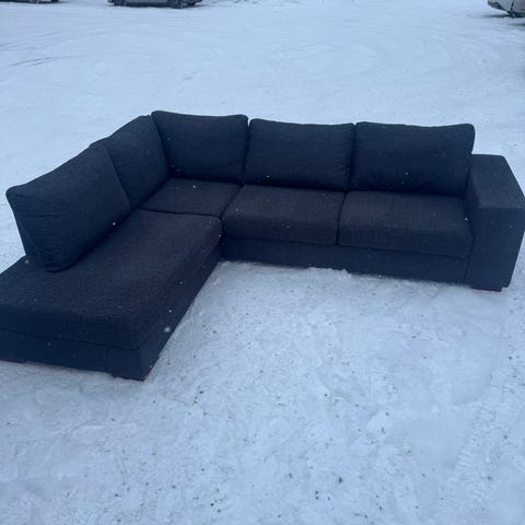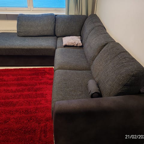 Harmaa kulmadivaani, jossa vuodemekanismi. Sohva on verhoiltu tummanharmaalla kankaalla. Istuinosat muodostavat L-muotoisen kokonaisuuden, ja sohva voidaan levittää vuoteeksi. Sopii olohuoneeseen istuma- ja nukkumispaikaksi. Sohvassa on käsinoja toisella sivulla ja selkänojat koko pituudelta.