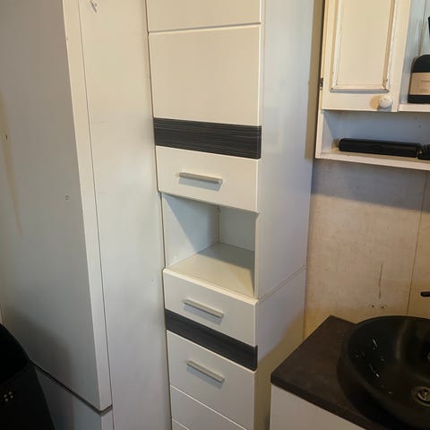 Pitkä valkoinen seinään kiinnitettävä kaappi, jossa jalat. Ollut eteisaulassa. Sisällä 8 hyllyä.