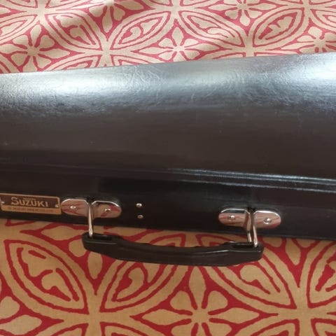 Siistikuntoinen ja ehjä Suzuki viulukotelo 90-luvulta. . Kovakantinen musta kotelo, jossa vaalea sisus. Sisällä erillinen lokero hartsille. Pieniä käytön jälkiä varmasti löytyy, mutta ikäänsä nähden erittäin hyväkuntoinen.. Kotelon pituus ulkoa 56 cm ja sisällä viululle tilaa pituudelta max 44,5 cm. Tämä siis lasten viulukotelo, luultavasti 1/8 -viululle. Vain nouto.