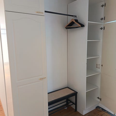 Vaikka varastoon kaapit (kuvissa keskimmäiset). Yläkaappi on irrallinen, kokonaiskorkeus 220cm. Kapeammassa (39cm) sisällä tanko ja kaksi hyllyä. Leveämmän (50cm) sisällä kaksi vedettävää verkkokoria ja kolme hyllylevyä. Yhteensä siis noin KxSxL 220x58x90cm.
