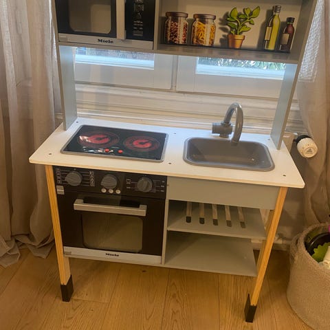 Hyväkuntoinen lasten leikkikeittiö tarvikkeineen odottaa uusia leikkijöitä!