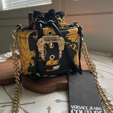 Myytävänä kerran käytetty Versace Jeans Couture Chain Couture -crossbody-laukku, joka on valmistettu tekonahasta ja koristeltu tunnusomaisella Baroque-printillä sekä ikonisella logonauhalla. Mukaan tulee dustbag ja hihna on säädettävä. Mitat: L24,5cm K16,5cm S10cm.