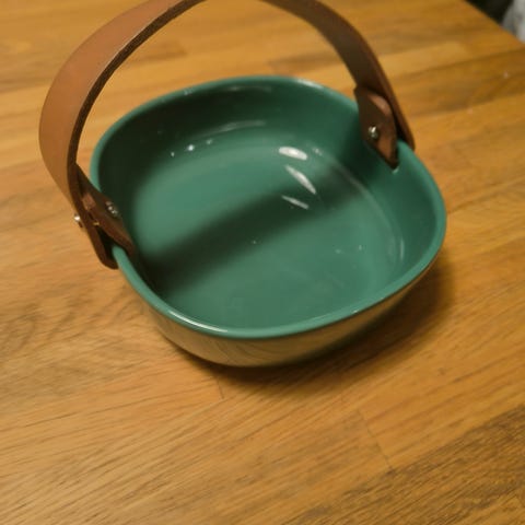 Marimekko kulho, jossa nahkainen kantokahva. Ei juurikaan käytetty, pohjasta löytyy alkuperäinen tarra.