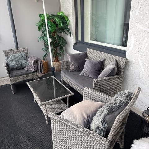 Monivärinen polyrottinkinen puutarhasohva, jossa on mukana leikkisät raidalliset pehmusteet. Sohva koostuu istuinosasta ja kahdesta ulosvedettävästä rahista, jotka toimivat myös tarvittaessa pöytänä. Mahtuu pieneenkin tilaan. Päällä jokaiselle osalle pehmuste värikkäällä kuosilla. Sohva edustaa modernia retrotyyliä, jossa yhdistyvät kirkkaat värit ja yksinkertainen muotoilu. Tämä tyyli on suosittu ulkokalusteissa, koska se tuo eloa ja väriä puutarhaan tai terassille.