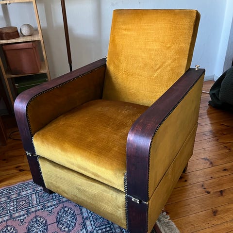 Hakusanat: puurunko, nojatuoli, nojatuolit, lepotuoli, huonekalu, verhoilu, huonekalut, barcelona, keltainen, Valmistaja, käytetyt huonekalut, cjc-concepta, Tuoli, tuolit, retro