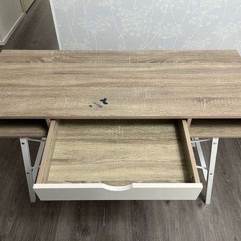 Muuten hyvä kuntoinen, mutta muutamia naarmuja/osumakohtia sekä vaaleita tahroja pinnassa.