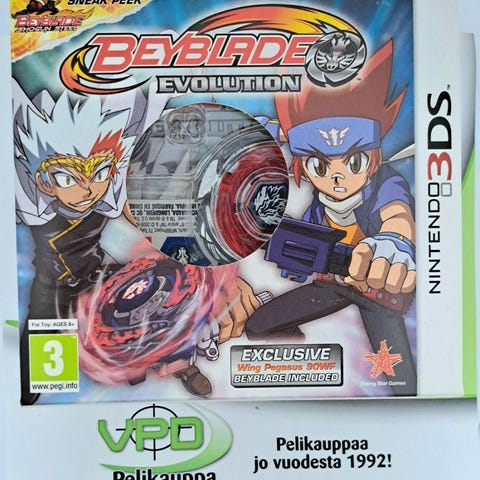 Nintendo 3DS Beyblade Evolution -peli. Taistelupelityylinen Beyblade-aiheinen videopeli Nintendo 3DS -konsolille. Ikärajasuositus PEGI 3. Fyysinen pelikasetti kotelossa (näkyy kuvassa).