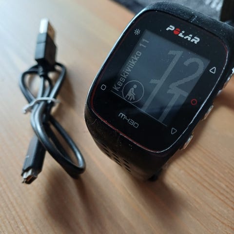 Polar Ingnite kello, mukaan muutama ranneke, laturin piuha ja näytönsuojia.