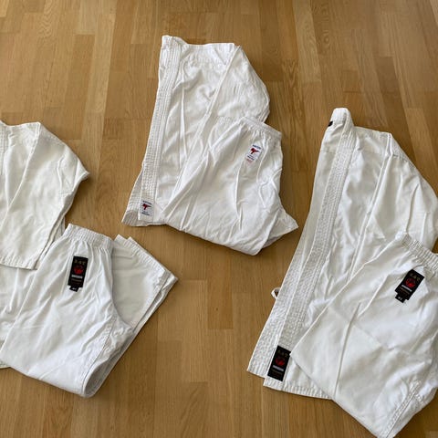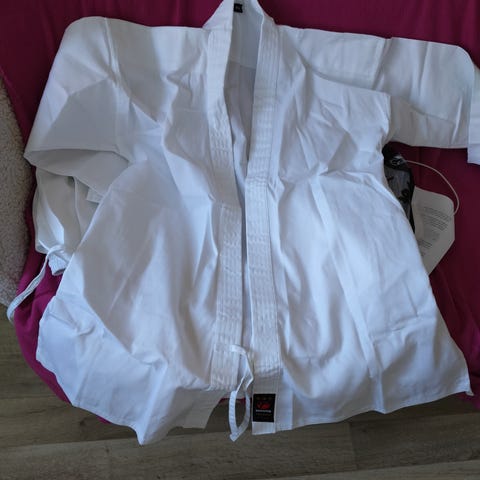Tarpeettomaksi jäänyt, yhden "vyövälin" käytössä ollut, laadukas kamppailupuku. Keltainen vyö saattaa myös löytyä jostain. Koko paketti tai erikseen