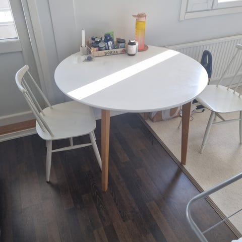 Myydään kuvan mukainen tammen värinen 120 cm halkaisijalta oleva ruokapöytä. Pöytä muuten hyvässä kunnossa, mutta kannessa pientä käytönjälkeä, joka näkyy kuvassa.