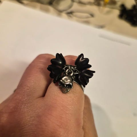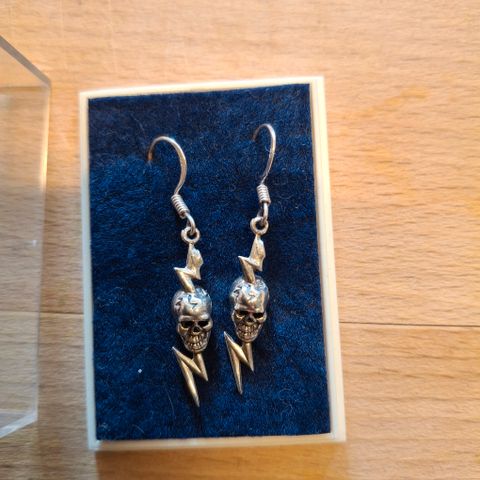 Pinkit roikkuvat pääkallokorvikset rockersi tekemät. Hopeisen värisen osat.