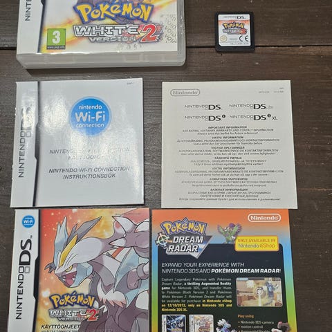 Nintendo DS New Super Mario Bros. ja Pokémon White pelit. Molemmat pelit Nintendo DS -konsolille, mukana pelikasetit ja kotelot. New Super Mario Bros. on tasohyppelypeli, Pokémon White roolipeli Pokémon-sarjasta. Sopivat Nintendo DS -yhteensopiviin laitteisiin, kuten Nintendo DS, DS Lite, DSi ja 3DS -konsolit.