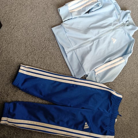 Paljon käytetty Adidaksen verkkapuku, ihanat värit, minttu +tumman sininen. Ehjät mutta vaaleassa värissä tahraa.