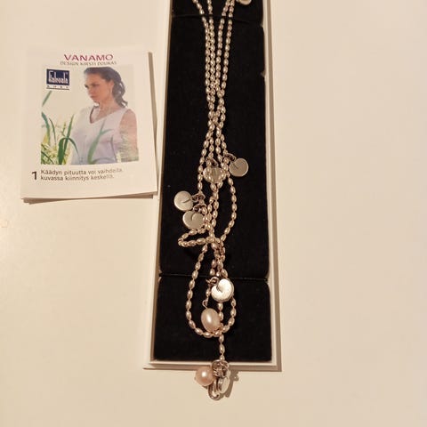 Kalevala Vanamo- korusetti naisille, materiaaleina hopea ja helmet. Settiin kuuluu pitkä kaulakoru, rannekoru sekä roikkuvat korvakorut. Kaikissa osissa on hopeinen palloketju ja pienet riipukset, joissa yhdistyvät hopea ja vaaleanpunaiset helmet. Koruja on käytetty muutaman kerran, korvakoruja ei kertaakaan. Korut ovat ehjiä ja virheettömiä.