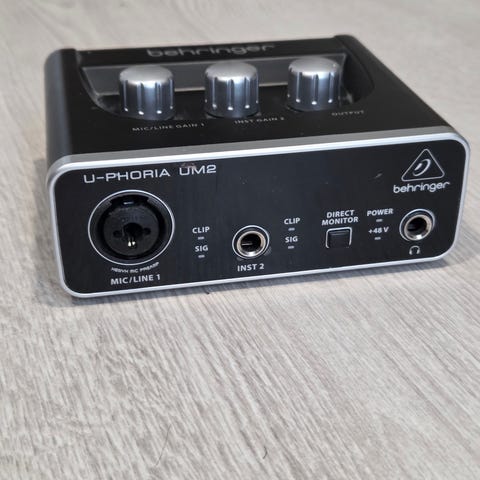 Behringer U-Phoria UM2 USB-äänikortti. Kompaktissa äänikortissa on XLR/plugiyhdistelmäliitin mikrofonille tai instrumentille sekä erillinen plugitulo. Laitteessa on gain-säätimet sisääntuloille ja erillinen output-säätö. Takapaneelissa on RCA-lähdöt sekä USB-liitäntä tietokoneeseen kytkemistä varten. Soveltuu esimerkiksi kotitallennukseen, podcastaukseen tai musiikin äänitykseen tietokoneen kanssa.