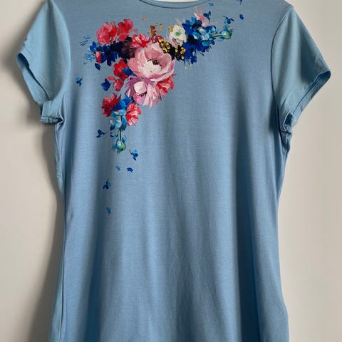 Arkeen ja juhlaan sopiva Ted Baker sinivalkoinen toppi, osin neuletta, osin sileää kangasta. Mukana silkkiä. Takaa pidempi malli. Kai-kai 54cm, edestä pituus 61cm ja takaa 69cm. Hyvä vähän käytetty kunto.