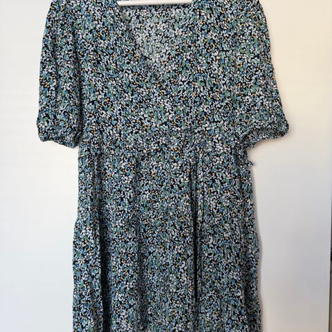 Stradivarius kesämekko naisille, koko S. Mekossa on kirjavakuvioinen kangas, jossa pieniä kukkia tummalla pohjalla. Materiaali on pääosin viskoosia, jossa on hieman elastaania joustavuuden lisäämiseksi. Mekossa on pitkät hihat ja V-pääntie sekä hieman levenevä helma. Sopii arki- ja vapaa-ajan käyttöön lämpimiin säihin. Käyttämätön.