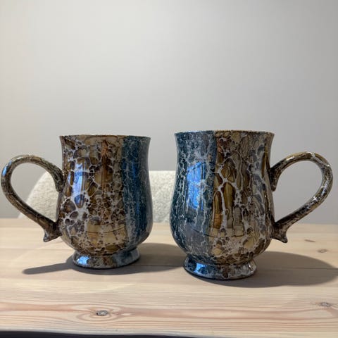 Myydään Keraamikko pentti kuitusen (mikkeli) valmistama laadukas ja yhtenäinen keramiikkasarja 1980-luvulta. Kaikki esineet ovat käsintehtyä kivitavaraa ja niissä on upea eläväinen koboltinsininen lasite. Esineet ovat erinomaisessa kunnossa ehjiä ja puhtaita. Setti sisältää (mitat, korkeus x suuaukon halkaisija). 1. Suuri tarjoilukulho korkeus 8.5cmx24.5cm, (pohja 20cm) kaunis reikäkuvioitu reuna. 2. Suuri tuikkulyhty korkeus 18.5cmx12.5cm(levein kohta 17cm) luo upean valonleikin. 3.maljakko korkeus 15cmx11cm tyylikkäät dreijausurat. 4.kannellinen sipulipurkki korkeus 13cmx11.5cm varustettu aidolla paksulla kaarnakorkilla. 5. Matala tuikkulyhty korkeus 9cmx12cm. Tiheä tunnelmallinen reikä kuviointi. Tämä on harvinainen tilaisuus hankkia kerralla koko yhtenäinen sarja kotimaista käsityötä, myydään ensisijaisesti koko settinä.