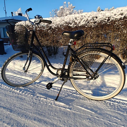 Kevyesti rullaava 1-vaihteinen citypyörä. Jalkajarru. Renkaat 28". Runkokoko 50 cm (sopiva yli 165 cm pituisille).