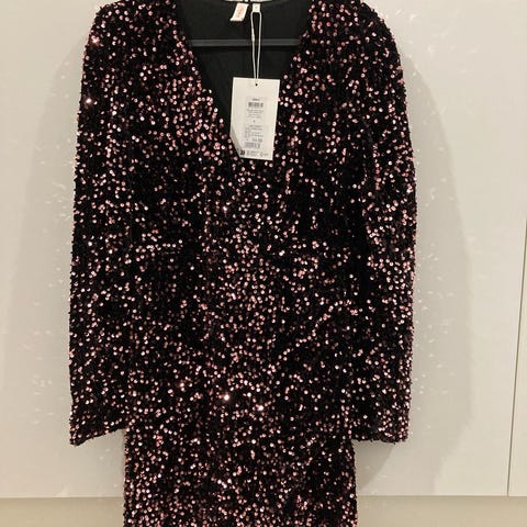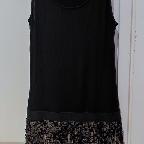Naisten musta juhla- tai cocktailmekko koko S. Paljettimekko näyttävällä kullan- ja hopeansävyisillä paljeteilla. Mekko on vuorillinen.